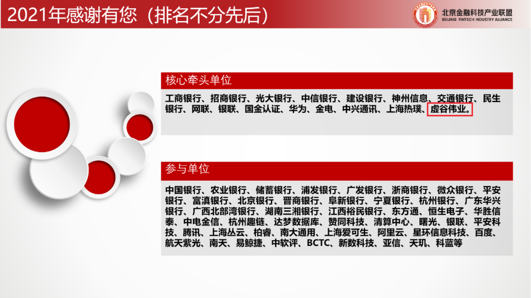 虚谷作为北京金融科技产业联盟的主要力量,分布式专委会核心牵头单位之一,2021年参与了各项标准、白皮书工作,未来依旧会持续向金融科技产业联盟贡献自己的力量。