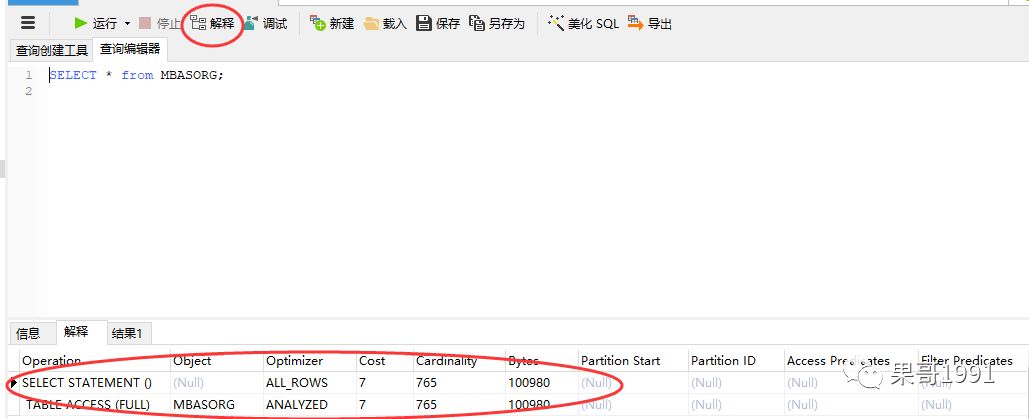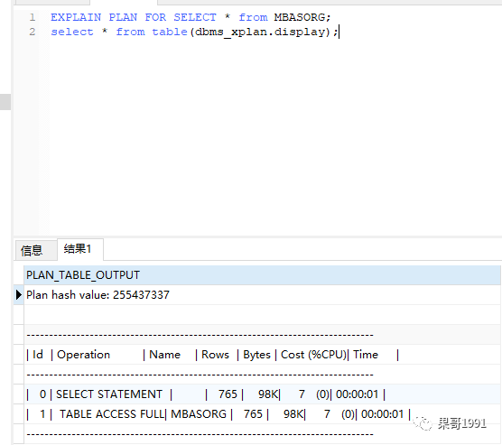 通过EXPLAIN PLAN FOR SELECT * from “表名”;