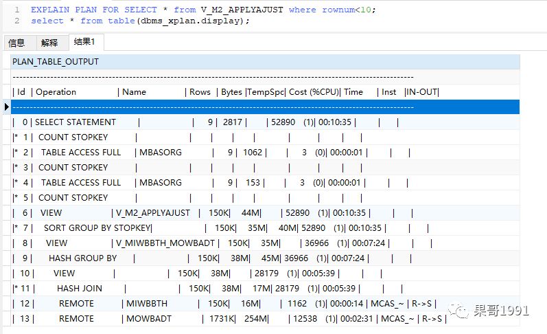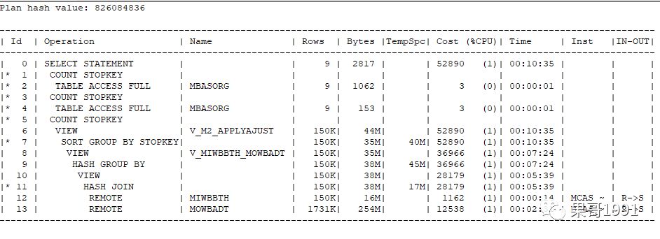 执行完Hash Group by之后,在第8行又返回了一个临时结果集,接着又对MBASORG表做了两次TABLE ACCESS FULL(全表扫描),之后这个sql就算是执行完了