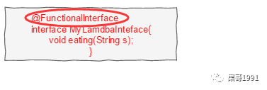 这种只有一个接口函数需要被实现的接口类型,叫“函数式接口”,为了避免后来的人在这个接口中增加新的接口函数导致有多个接口函数需要被实现,变成“非函数接口”,我们可以在这个接口上添加一个声明@Functionallnterface,这样别人就无法再里面添加新的接口函数了