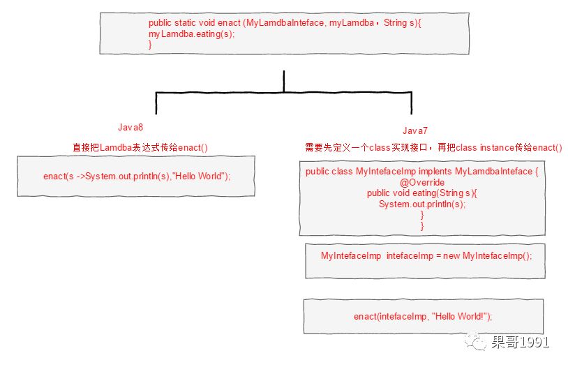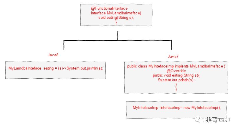 由于Lamdba可以直接把Lamdba作为参数传给函数,而传统的Java必须有明确的接口实现的定义,初始化才行: