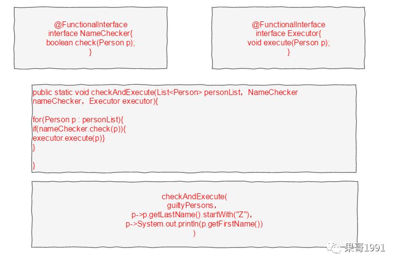 如果是用原生态的Lamdba写法的话,定义两个函数式接口,定义一个静态函数,调用静态函数并给参数赋值Lamdba表达式