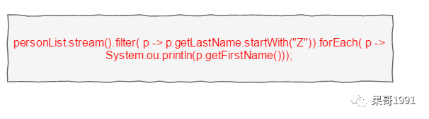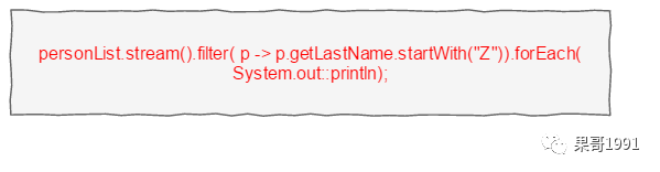 那么这对比最开始的Lamdba表达式的写法,已经非常的简洁了,但是这个时候如果说要println这个人的全部的信息,那么就可以利用Method reference来继续简化,什么式是Method reference,就是用已经写好的Object/Class的method来代替Lamdba expression,格式如下: