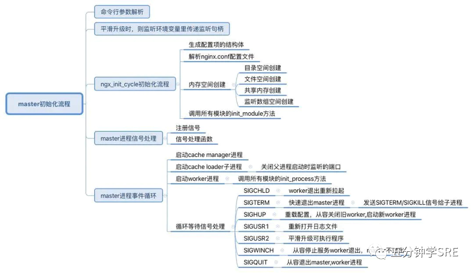 master进程充当整个进程组与用户的交互接口,同时对进程进行监护。它不需要处理网络事件,不负责业务的执行,只会通过管理worker进程来实现重启服务、平滑升级、更换日志文件、配置文件实时生效等功能。