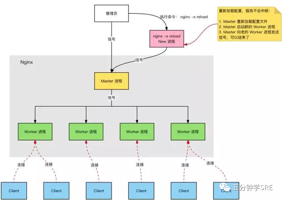 nginx用一个独立的worker进程来处理一个请求,一个worker进程可以处理多个请求: