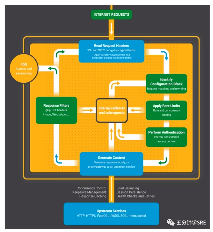 Generate Content:生成返回给用户的响应。为了生成这个响应,做反向代理的时候可能会和上游服务(Upstream Services)进行通信,然后这个过程中还可能会有些子请求或者重定向,那么还会走一下这个过程(Internal redirects and subrequests)。