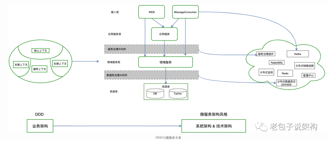 DDD的核心诉求就是将业务架构映射到系统架构上,在响应业务变化调整业务架构时,也随之变化系统架构。而微服务追求业务层面的复用,设计出来的系统架构和业务一致;在技术架构上则系统模块之间充分解耦,可以自由地选择合适的技术架构,去中心化地治理技术和数据。