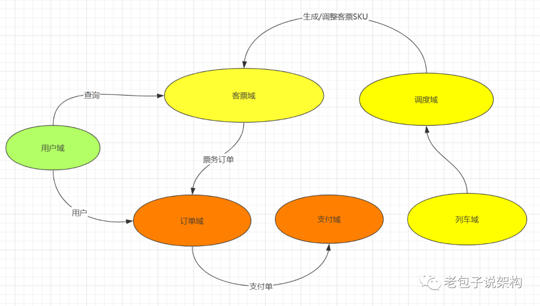 12306是一个典型特殊商品电商模型包含基本的商品域(票域)、订单域、支付域、用户域,再设计一个调度域。
