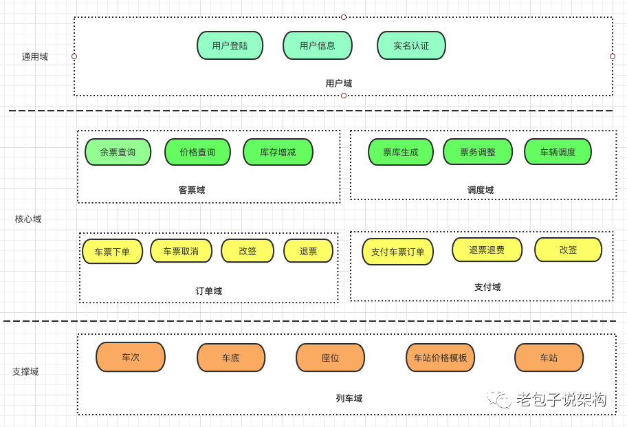 至此,火车票的核心模块基于宏观层面的建模就基本完成。当然一个这么大的系统是需要一个架构师团队去搭建的。基于此模型,把各个域再分配到架构师手里里面做概要设计。