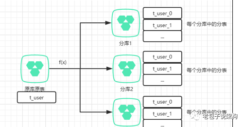 如上图所展示的,表通过函数fx的计算后被分散到不同数据库的不同表中。这里可以简单代入一种分库算法——id取模。