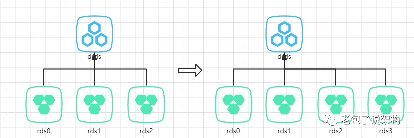 以上都是倍数增长的扩容方案,对于中小型的企业来说,数据库资源的开销很是很大的。用2实例到4实例的费用就增长了一倍,而从4实例到8实例又增长了一倍。那么非倍数扩容的方案是如何的呢?