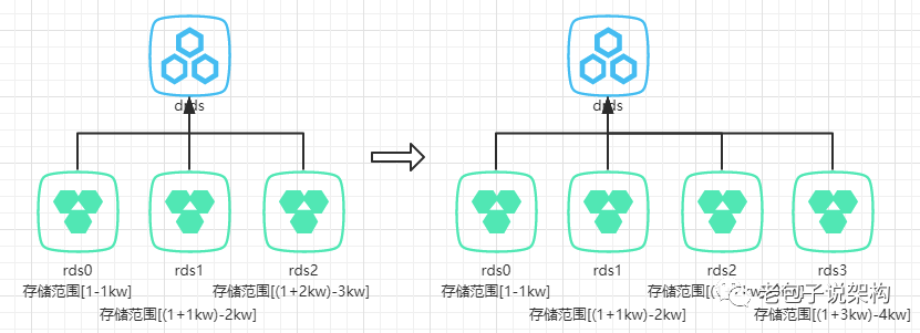 答案当然是有的,就是将分库的规则修改为按段分库。如下图所示,如果我们分三个库,每个库中有两张分表(分表规则还是按取模运算),那么一共可以存储3kw的数据,其中分库规则为id的值在[1,1kw]的会被存储到0库上,在[1kw+1, 2kw]范围的会被存储到1库,在[2kw+1, 3kw]范围的会被存储到2库。当我们的数据量突破3kw时,我们只需要增加一个分库,用于存储[3kw+1, 4kw]范围的数据即可,完全不需要对前三个分库的数据做处理。同理,也可以基于时间的分库方式。