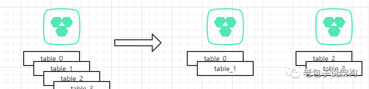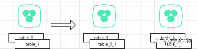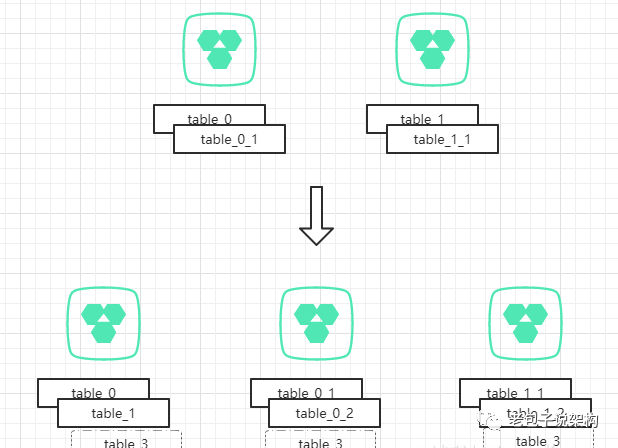 模式2与模式1有类似之处,在扩展阶段,还是选择整表迁移的方式,为了简化说明,此处使用两个分表来做说明。