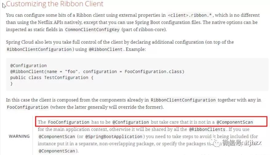 看上面红圈的内容:The FooConfiguratuib has to be @Configuration but take care it is not in a @ComponentScan for the main application context.意思就是那个自定义的规则算法必须要有@Configuration注解,但是要注意,它不能在@ComponentScan扫描的包下,也就是不能与启动类同级或者下级,否则所有的服务算法都用你自定义的,达不到特殊化定制的目的了。