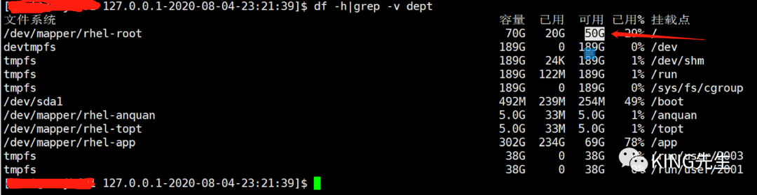 再次df -h 查看,目录使用已经变成了98%,虽然较高,但是服务器可以正常运行,监控文件可以正常生成了;