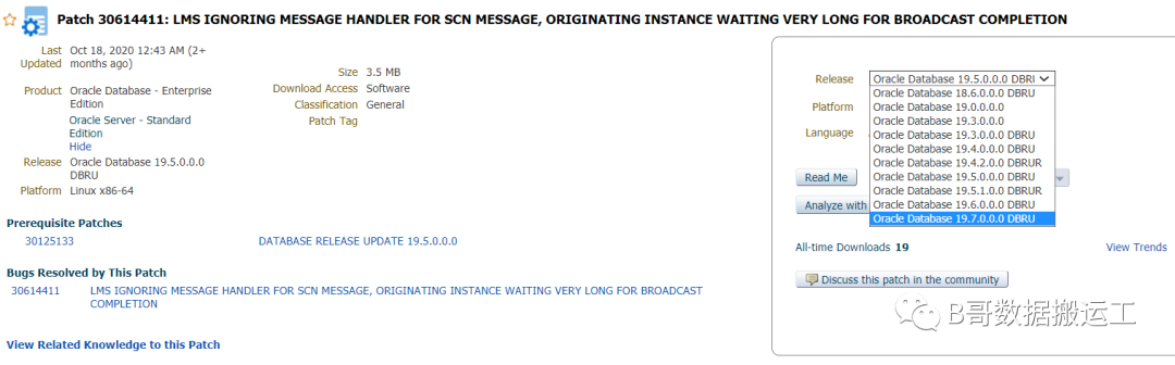 背景:写这篇文章的前提是,近两个月来,接连有几个应用报生产commit缓慢问题,他们都有一些共同点,就是数据库版本均为Oracle 19.5,运行在Linux x86平台,系统的负载均很低,log file sync平均等待时间很高,有的高达几秒,但log file parallel write平均等待时间不到1毫秒,而在lms、lgwr日志却能看到大量的log writ broadcast wait time超过500毫秒的警告信息。该问题是命中Oracle Bug。从官方截取下图,可以看到,这个问题在19.8版本之后已经解决了,19c的其它版本需要打上对应的Patch。本文重点不是探讨这个BUG。