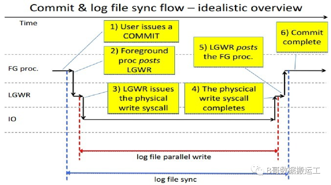 从下图可以看到,log file sync生命周期指的是用户发出commit,直至收到日志已落盘完成,一共经历这6个阶段。如果这个过程等待时间过长,则意味着应用commit响应缓慢。图中,若log file sync(蓝色实线)平均等待时间较长(比如超过15ms),而log file parallel write(红色实线)平均等待时间却小于10ms,则可以初步排除存储IO性能问题。