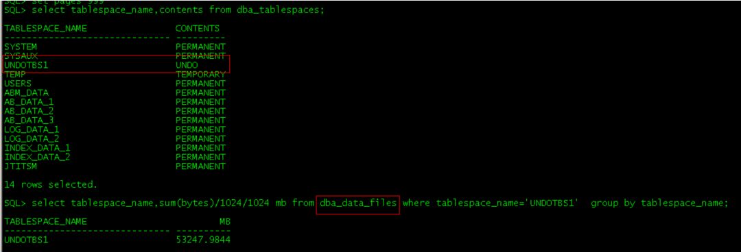select tablespace_name,sum(bytes)/1024/1024 mb from dba_data_files where tablespace_name='UNDOTBS1' group by tablespace_name;