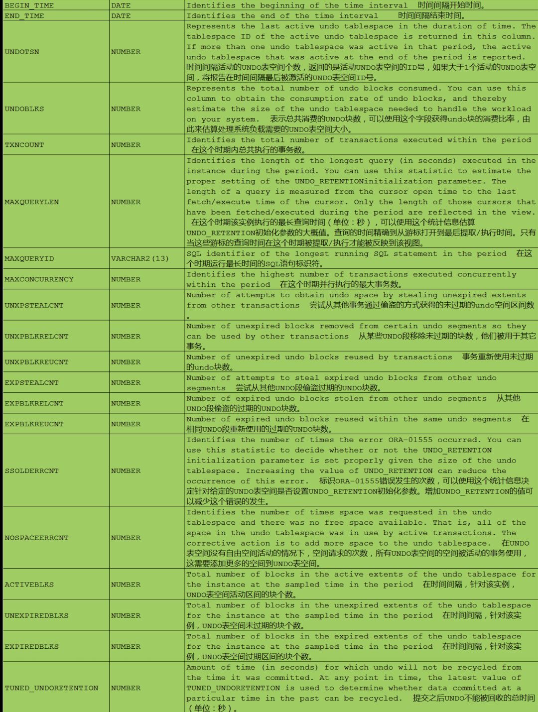 V$UNDOSTAT视图,该视图的作用是用于指导管理员调整UNDO表空间的参数及表空间大小,每行表示的是10分钟的数据,最多可保留576行,4天一个周期,如果该视图没有数据,那么UNDO可能是手动管理方式。下面对该视图字段的含义进行说明: