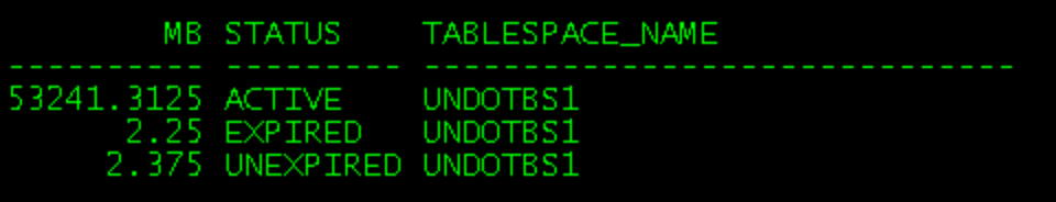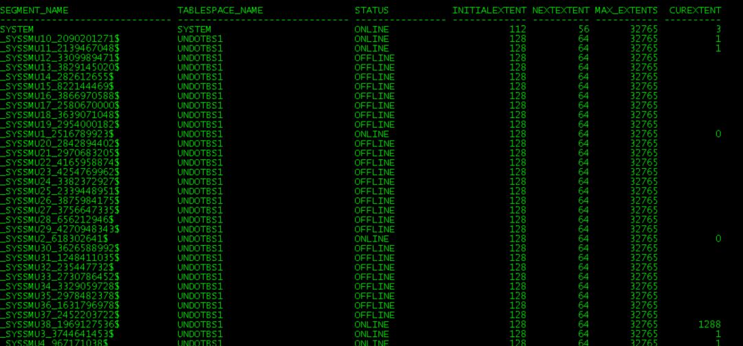 ACTIVE 表示未提交事务还在使用的UNDO EXTENT,该值对应的UNDO SEGMENT的DBA_ROLL_SEGMENTS.STATUS一定是ONLINE或PENDING OFFLINE状态,一旦没有活动的事务在使用UNDO SEGMENT,那么对应的UNDO SEGMENT就变成OFFLINE状态。 EXPIRED 表示已经提交且超过了UNDO_RETENTION指定时间的UNDO EXTENT。 UNEXPIRED 表示已经提交但是还没有超过UNDO_RETENTION指定时间的UNDO EXTENT。