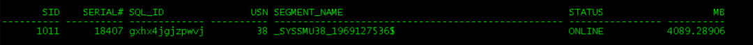 select s.sid,s.serial#,s.sql_id,v.usn,segment_name,r.status, v.rssize/1024/1024 mb
