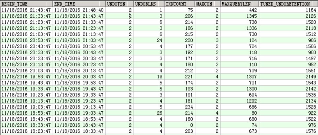 通常当字段UNXPSTEALCNT和EXPBLKREUCNT是非零值,表示有空间压力。如果字段SSOLDERRCNT是非零值,表示UNDO_RETENTION设置不合理。如果字段NOSPACEERRCNT是非零值,表示有一系列空间问题。在10g DBA_HIST_UNDOSTAT视图包括了V