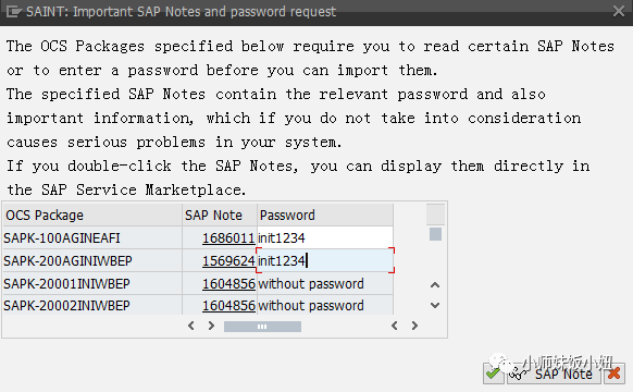 SAP在升级SAINT的组件时候,为了防止用户不付licensen的费用,所以在一些新增的组件上会做一些密码的设定,具体的可点击