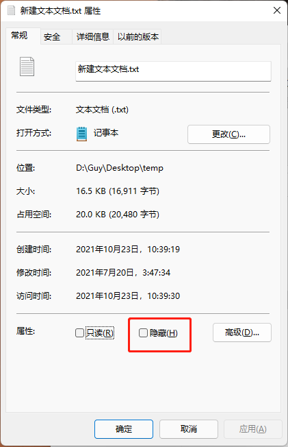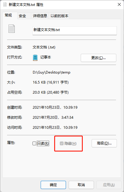 应用场景:当您的文件被归为系统文件且隐藏属性不可更改时,即文件属性弹窗中“隐藏”复选框呈灰色状态。