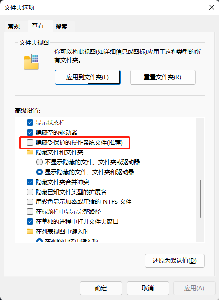 在“文件夹选项”设置中的“查看”选项卡,将“隐藏受保护的操作系统文件(推荐)”复选框取消选择即可。