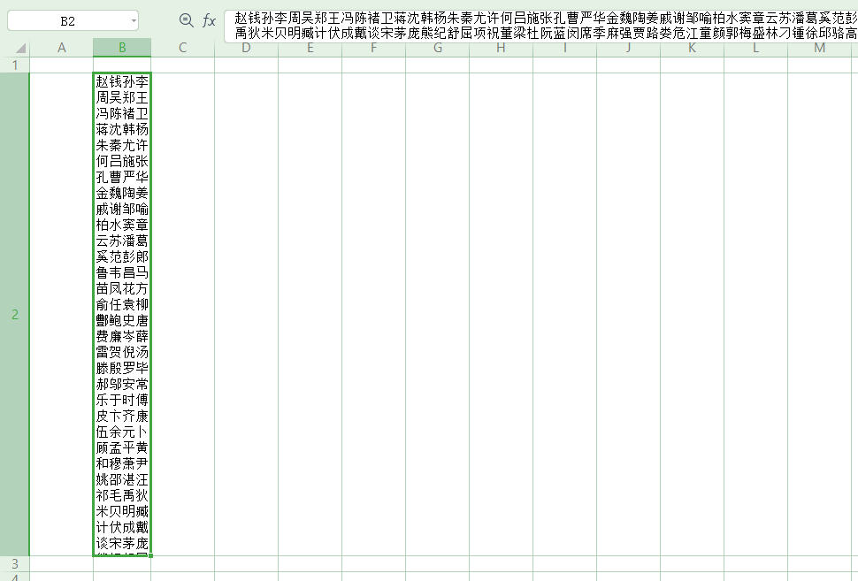 复制一些常见单字姓氏到 B2 单元格(去除空格断行等符号)
