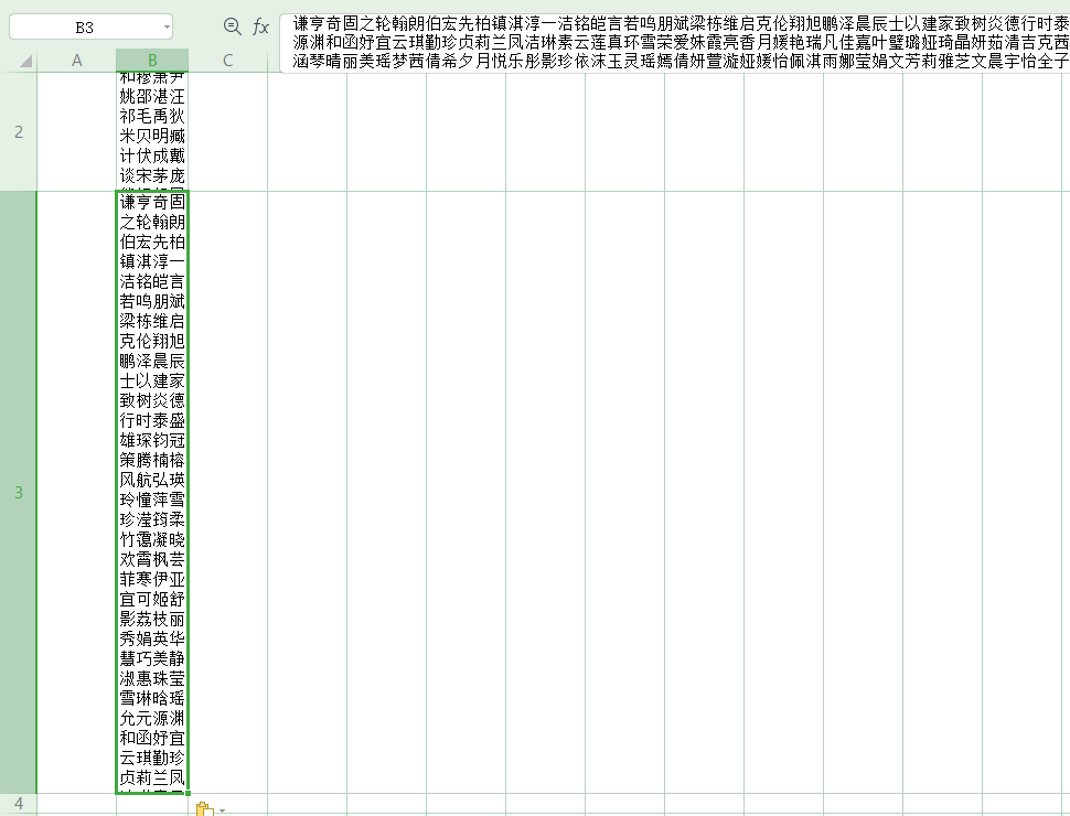 复制一些适合做名字的字到 B3 单元格(这些字要去除顿号等符号)