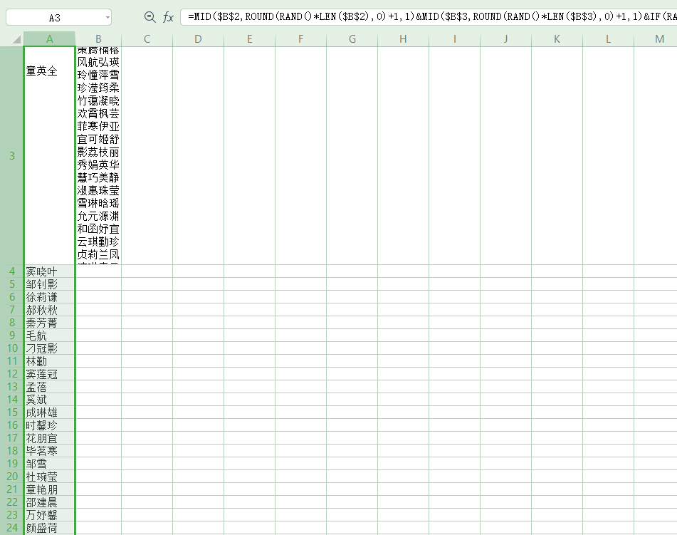 IF(RAND()>0.3,MID($B$3,ROUND(RAND()*LEN($B$3),0)+1,1),"") 如果本次 RAND() 值大于0.3,则名字再加一个字(即姓名共 3 个字),否则留空(即姓名共 2 个字);