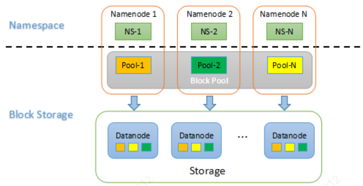 一个Block Pool由属于同一个Namespace的数据块组成,每个Datanode可能会存储集群中所有Block Pool的数据块。