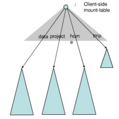 如上图所示,下面四个蓝色三角形代表一个独立的命名空间,上方灰色的三角形代表从客户角度去访问的子命名空间。各个蓝色的命名空间Mount到灰色的表中,客户可以访问不同的挂载点来访问不同的命名空间,这就如同在Linux系统中访问不同挂载点一样。