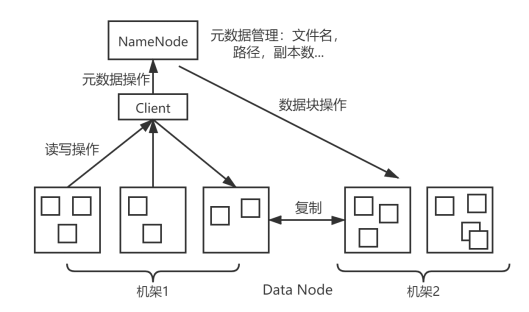 如图所示,HDFS包含两个关键组件:NameNode和DataNode。