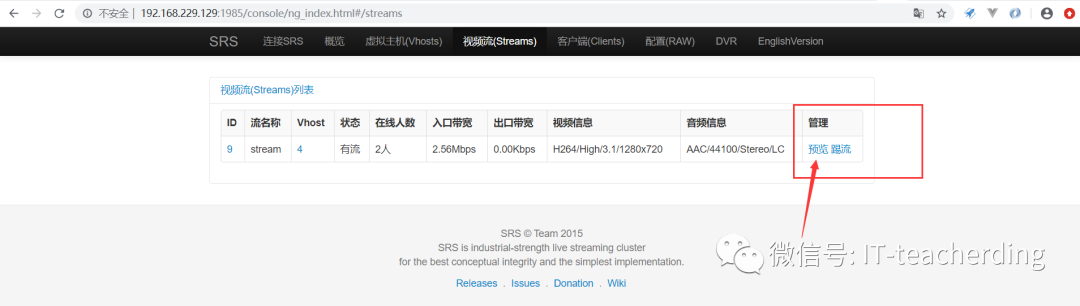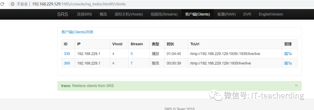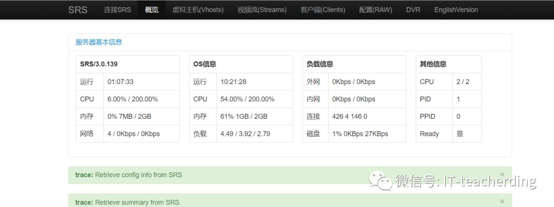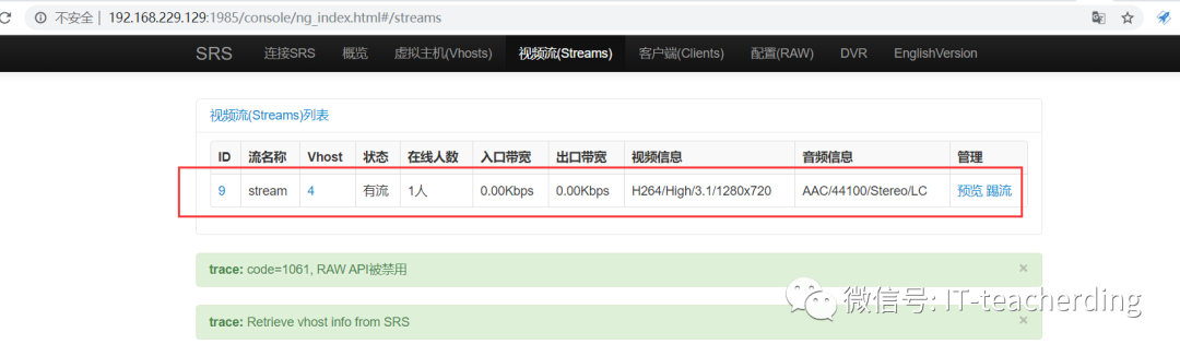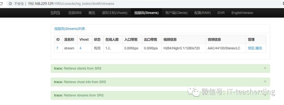 查看SRS的控制台页面会看到,服务器已经接收到RTMP流。
