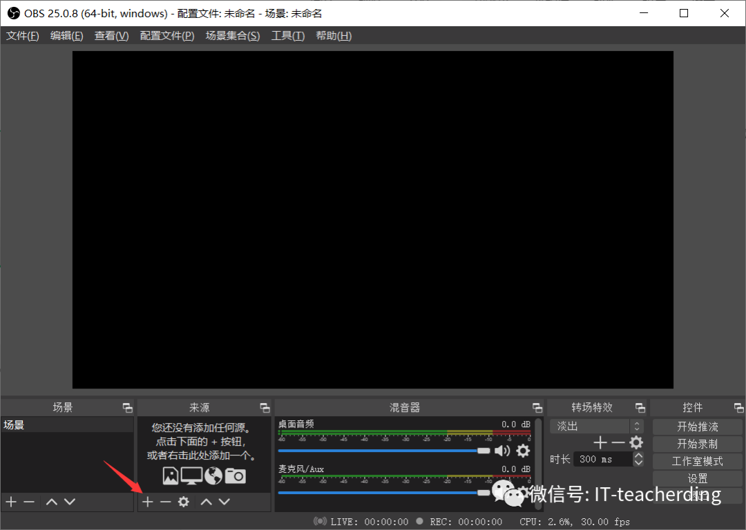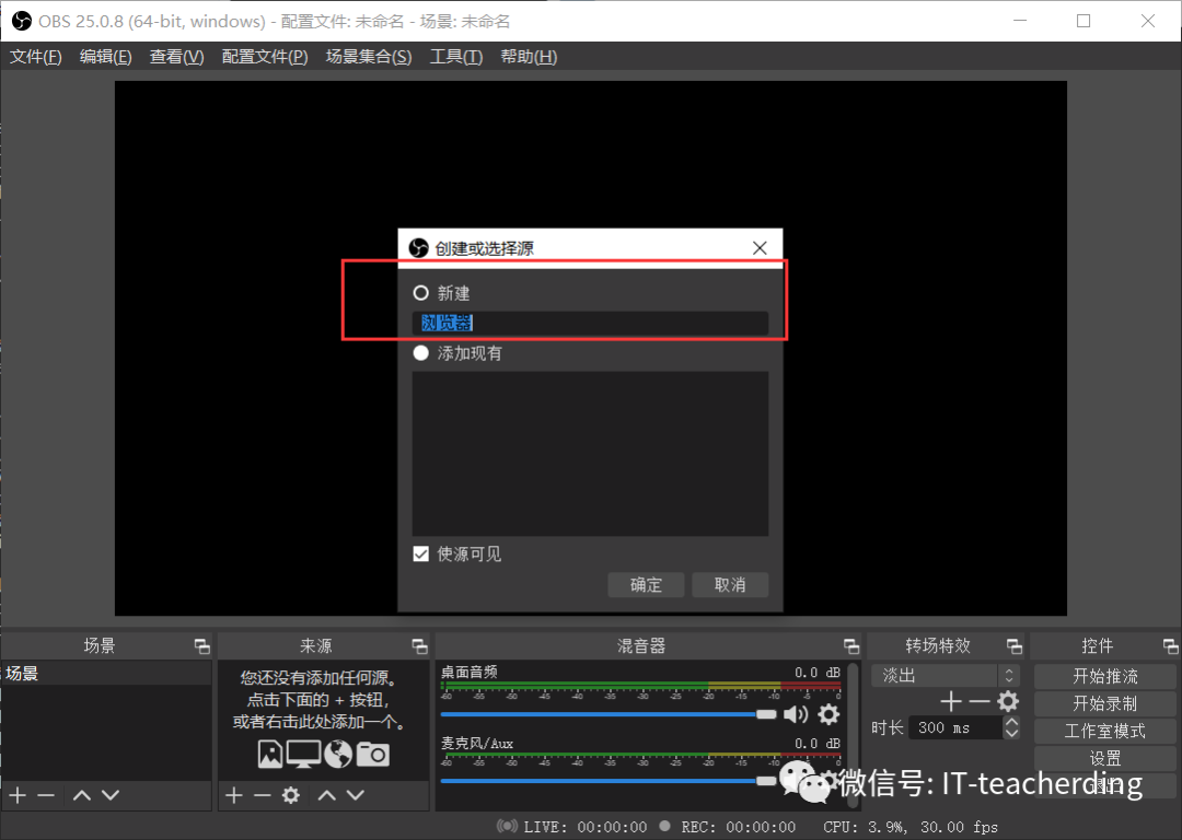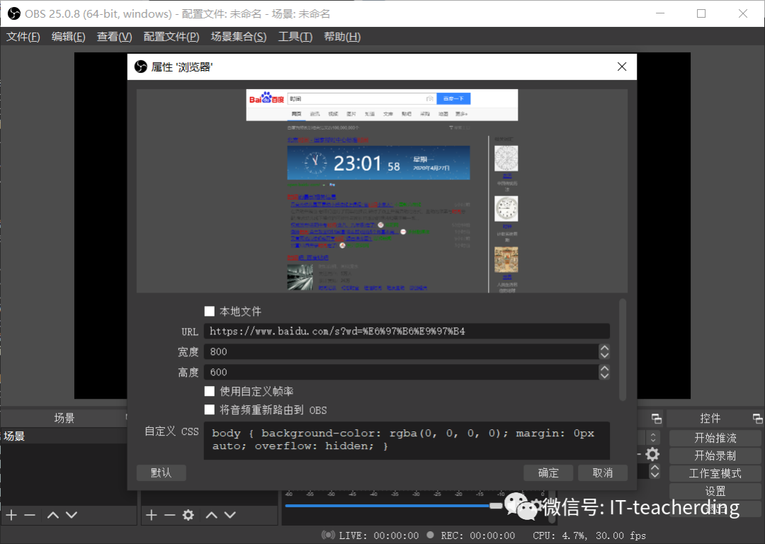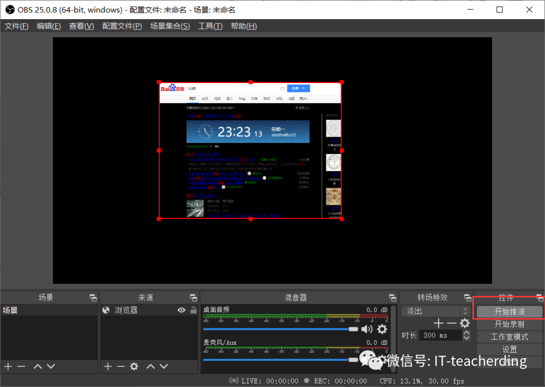 可选择桌面,摄像头,浏览器网址等,为了便于分析直播的延迟时间,这里的来源为浏览器网页上的实时时间