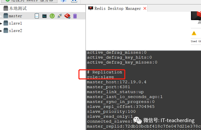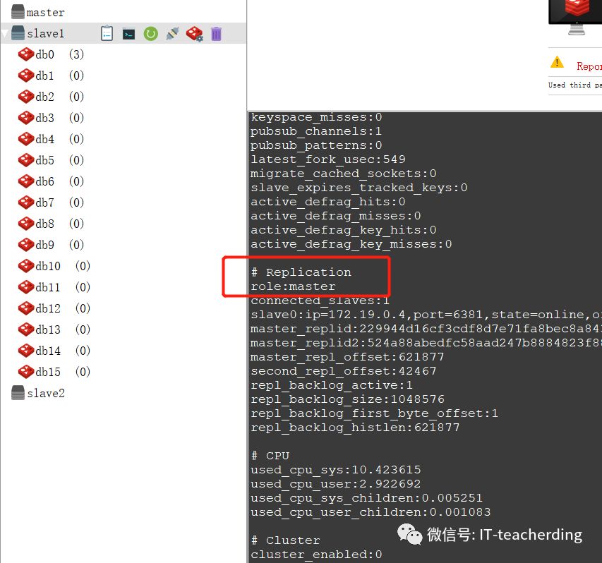 哨兵们会选举出新的,设立slave1 变成了master,使用info 命令查看。