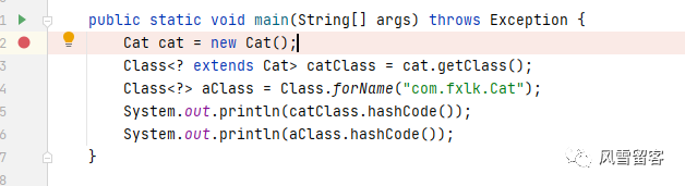 public static void main(String[] args) throws Exception {Cat cat = new Cat();Class<? extends Cat> catClass = cat.getClass();Class<?> aClass = Class.forName("com.fxlk.Cat");System.out.println(catClass.hashCode());System.out.println(aClass.hashCode());}