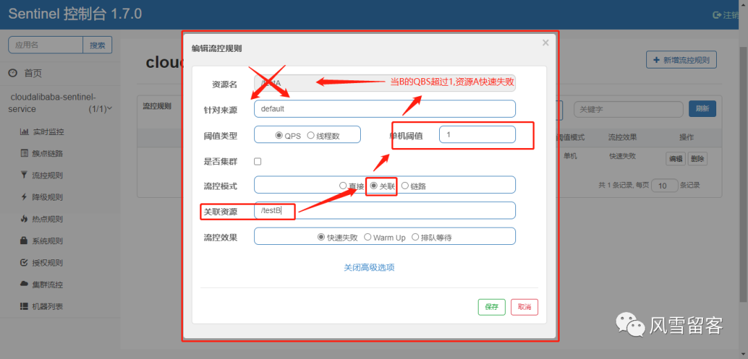 当关联的资源达到阈值时,就限流自己,比如:当与A关联的资源B达到阀值后,就限流A自己
