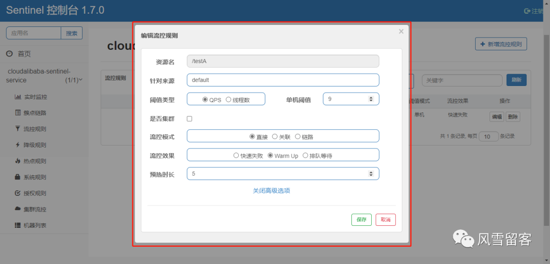 | controlBehavior | 流控效果(直接拒绝/WarmUp/匀速+排队等待),不支持按调用关系限流 | 直接拒绝 |