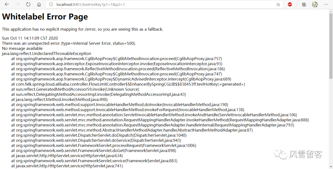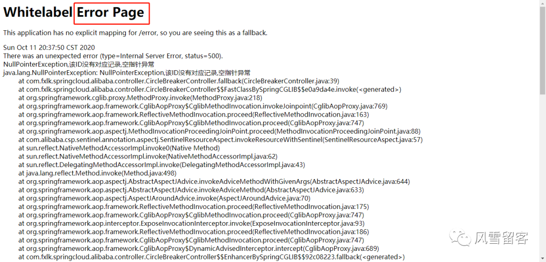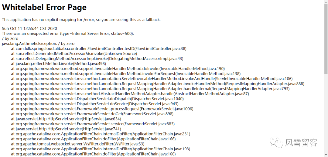 我们在业务类里面,只是用@SentinelResource(value = "fallback")定义了一个相当于名字的东西,没有做限流等配置,这样的话,如果代码出错,会直接跳转Error Page页面: