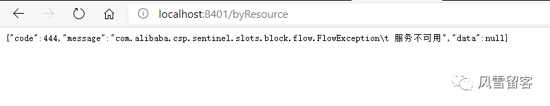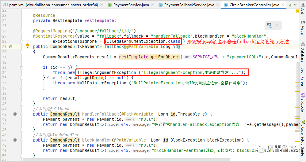 @RestController@Slf4jpublic class CircleBreakerController{public static final String SERVICE_URL = "http://nacos-payment-provider";@Resourceprivate RestTemplate restTemplate;@RequestMapping("/consumer/fallback/{id}")@SentinelResource(value = "fallback",fallback = "handlerFallback") //fallback只负责业务异常public CommonResult<Payment> fallback(@PathVariable Long id){CommonResult<Payment> result = restTemplate.getForObject(SERVICE_URL + "/paymentSQL/"+id,CommonResult.class,id);if (id == 4) {throw new IllegalArgumentException ("IllegalArgumentException,非法参数异常....");}else if (result.getData() == null) {throw new NullPointerException ("NullPointerException,该ID没有对应记录,空指针异常");}return result;}//本例是fallbackpublic CommonResult handlerFallback(@PathVariable Long id,Throwable e) {Payment payment = new Payment(id,"null");return new CommonResult<>(444,"兜底异常handlerFallback,exception内容 "+e.getMessage(),payment);}}