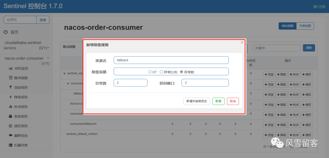 @RestController@Slf4jpublic class CircleBreakerController{public static final String SERVICE_URL = "http://nacos-payment-provider";@Resourceprivate RestTemplate restTemplate;@RequestMapping("/consumer/fallback/{id}")@SentinelResource(value = "fallback",fallback = "handlerFallback",blockHandler = "blockHandler")public CommonResult<Payment> fallback(@PathVariable Long id){CommonResult<Payment> result = restTemplate.getForObject(SERVICE_URL + "/paymentSQL/"+id,CommonResult.class,id);if (id == 4) {throw new IllegalArgumentException ("IllegalArgumentException,非法参数异常....");}else if (result.getData() == null) {throw new NullPointerException ("NullPointerException,该ID没有对应记录,空指针异常");}return result;}//本例是fallbackpublic CommonResult handlerFallback(@PathVariable Long id,Throwable e) {Payment payment = new Payment(id,"null");return new CommonResult<>(444,"兜底异常handlerFallback,exception内容 "+e.getMessage(),payment);}//本例是blockHandlerpublic CommonResult blockHandler(@PathVariable Long id,BlockException blockException) {Payment payment = new Payment(id,"null");return new CommonResult<>(445,"blockHandler-sentinel限流,无此流水: blockException "+blockException.getMessage(),payment);}}