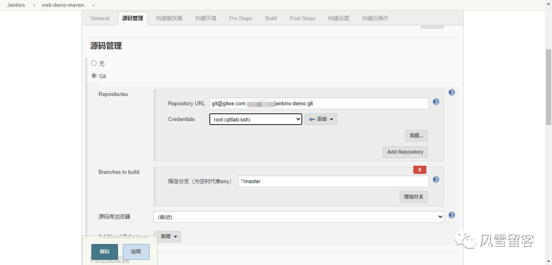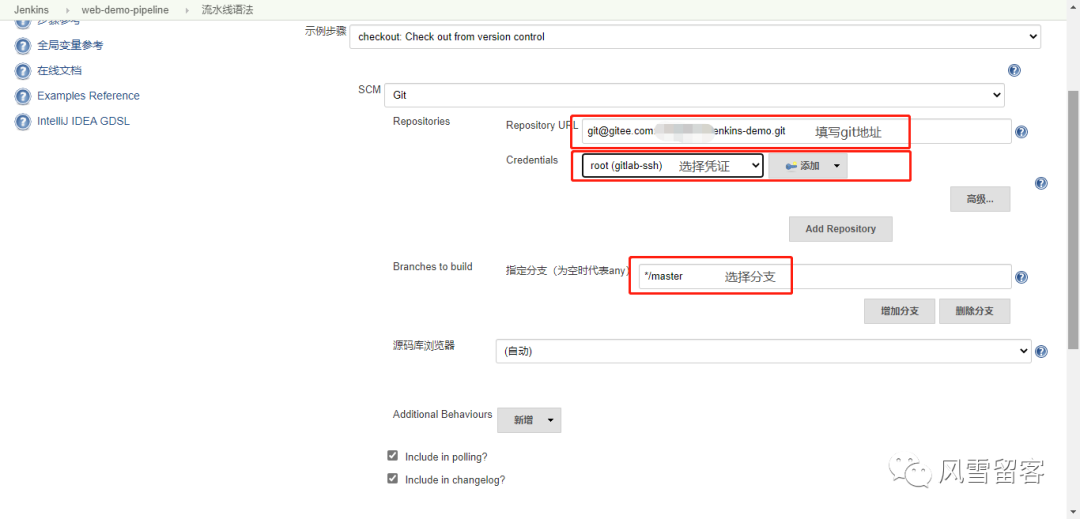 pipeline {agent anystages {stage('拉取代码') {steps {checkout([$class: 'GitSCM', branches: [[name: '*/master']], doGenerateSubmoduleConfigurations: false, extensions: [], submoduleCfg: [], userRemoteConfigs: [[credentialsId: 'ef0f4ce0-c68a-4607-9e25-21c38c50442f', url: 'git@gitee.com:此处填写你的码云地址/jenkins-demo.git']]])echo '拉取代码成功'}}}}