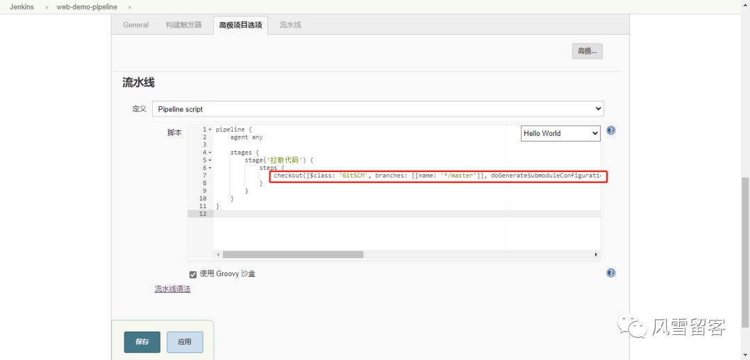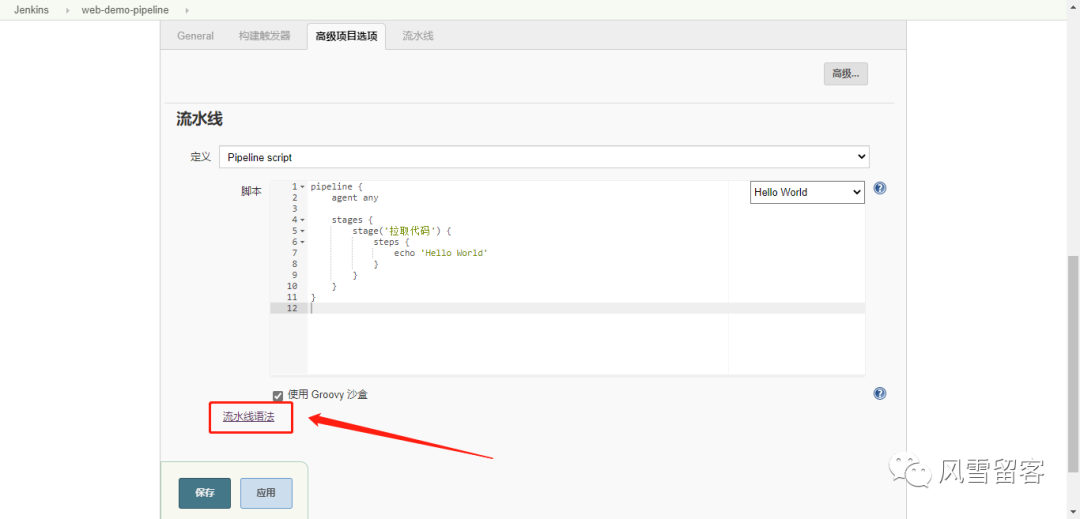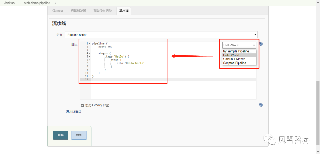 流水线->选择HelloWorld模板