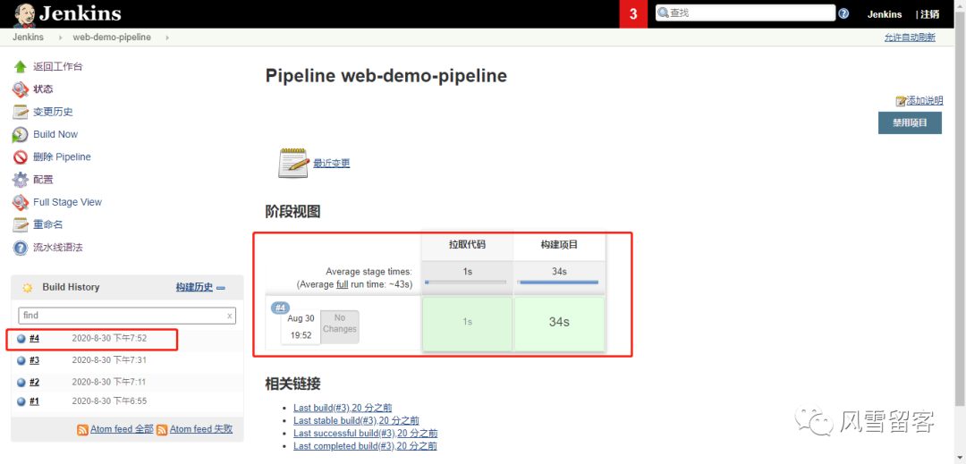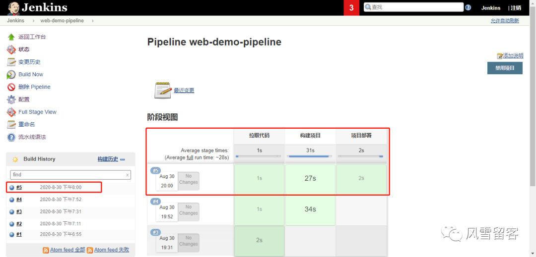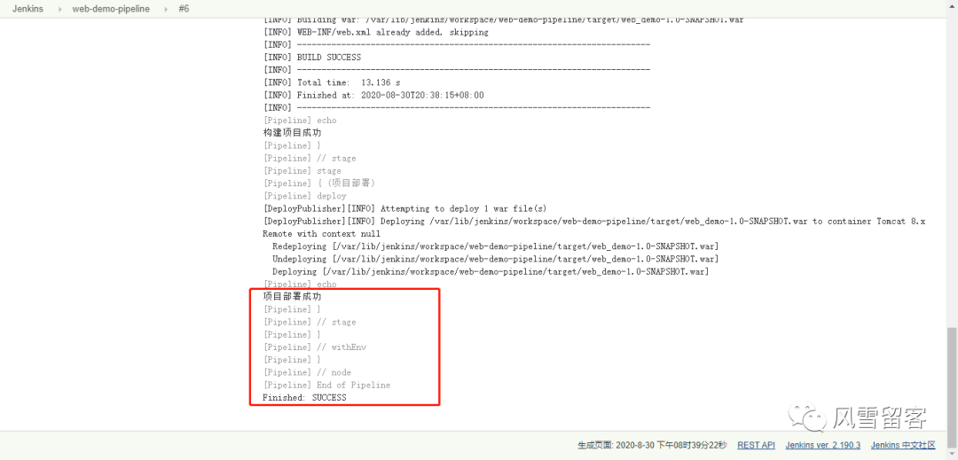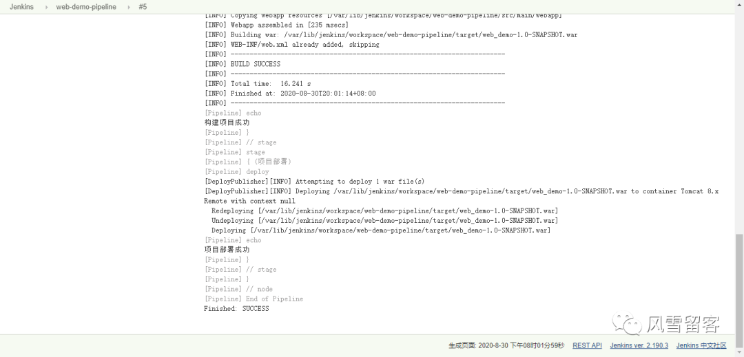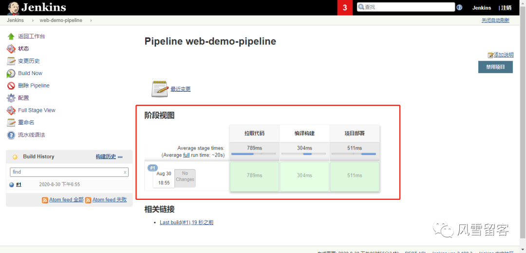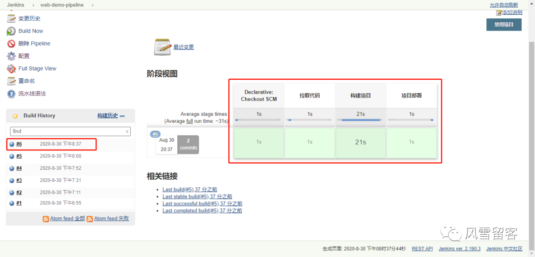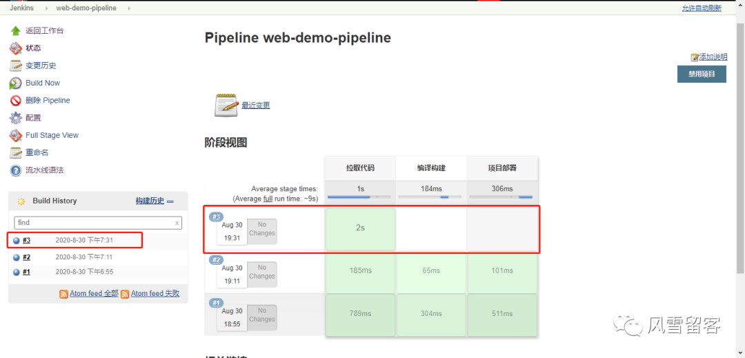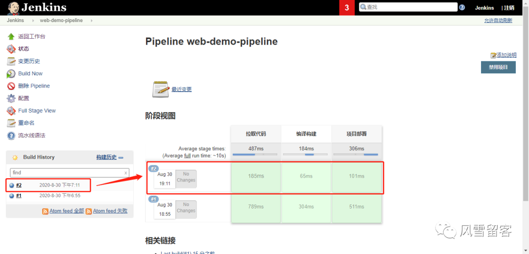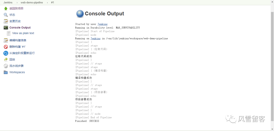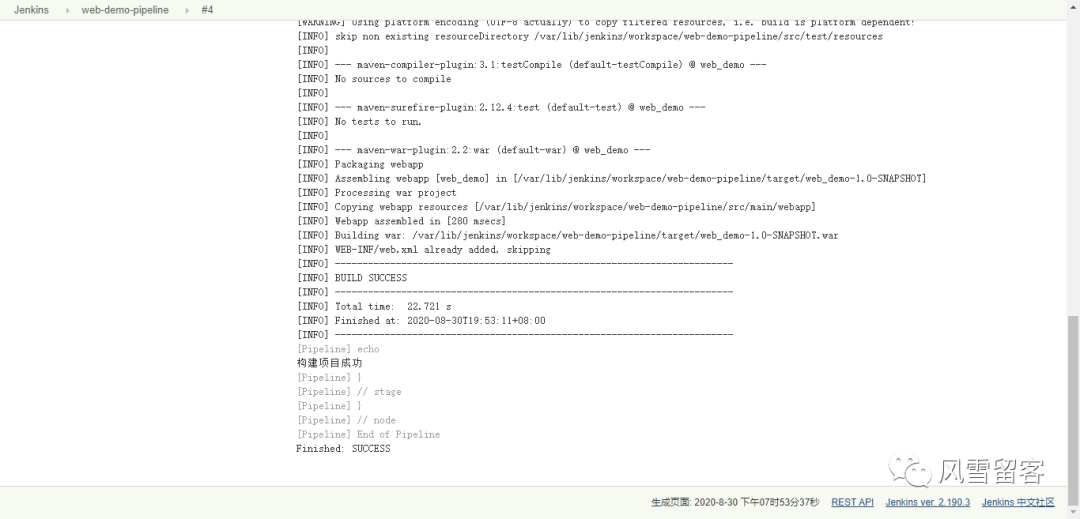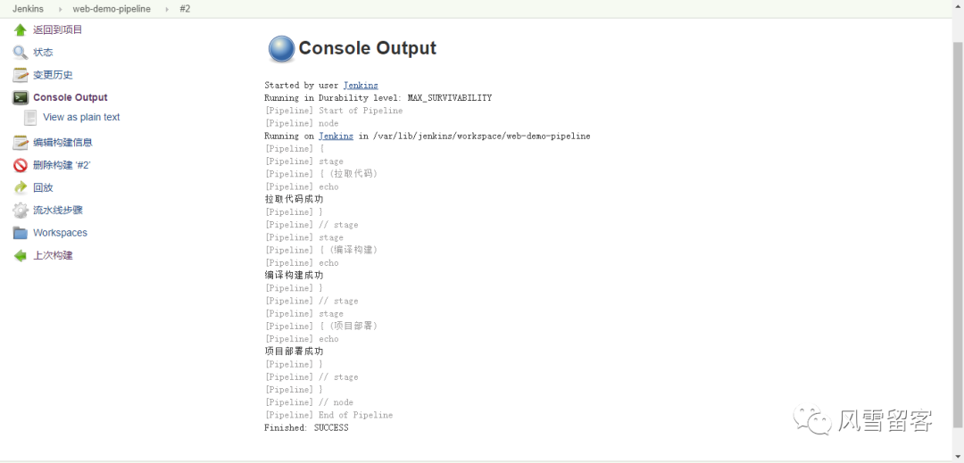 node {def mvnHomestage('拉取代码') {echo '拉取代码成功'}stage('编译构建') {echo '编译构建成功'}stage('项目部署') {echo '项目部署成功'}}