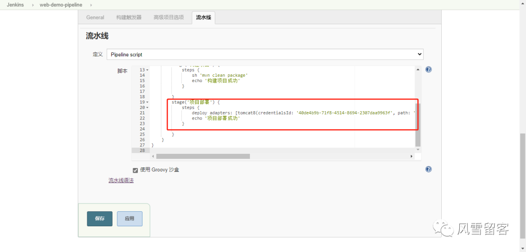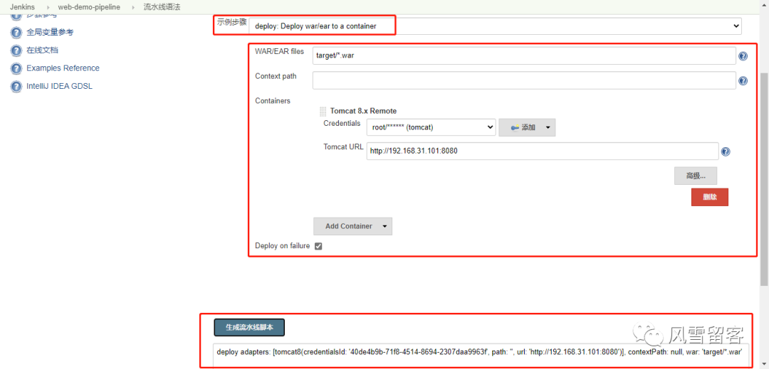 pipeline {agent anystages {stage('项目部署') {steps {deploy adapters: [tomcat8(credentialsId: '40de4b9b-71f8-4514-8694-2307daa9963f', path: '', url: 'http://192.168.31.101:8080')], contextPath: null, war: 'target/*.war'echo '项目部署成功'}}}}