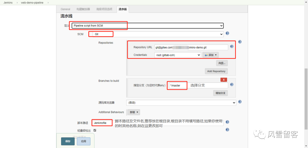 在流水线定义中选择Pipeline script from SCM,并填写相应的信息: