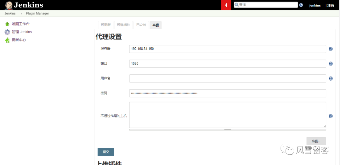 或者你也可以在菜单Manage Jenkins->Manage Plugins中,点击Advanced,把Update Site改为国内插件下载地址: